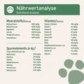 Das Produkt besteht zu 100 % aus natürlichen Rohstoffen wie Meeresalgenkalk, Malzkeimen, Bierhefe, Seealgenmehl, Leinsamenmehl, Eierschalen Pulver, Moringa sowie einer Kräutermischung mit Mariendistelfrüchten, Brennnesselblättern, Brombeerblättern, Kamille und Löwenzahnwurzel und eignet sich ideal als BARF Zusatz. Für eine Rundumversorgung Deines Lieblings empfehlen wir zudem die Fütterung von Knochen.